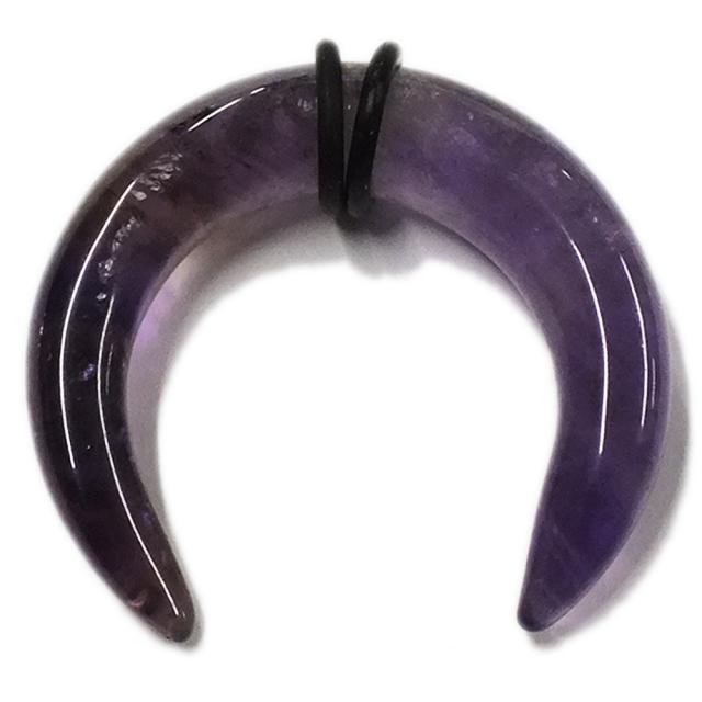 天然石の紫水晶を牙のような形状に削り出した尖鋭な拡張器のようなフォルムのボディピアス。パープル色の綺麗な色合いのストーンが上品に決まる男性からも女性からも人気のストーンプラグ。両端が尖鋭になってカーブしたテーパー形状のキバのようなボディピアスは拡張器のようなので装着もしやすく、素材も石なので金属アレルギーの心配もない。キャッチは黒色のゴムが2個付属していますが、別売りの透明や、キャッチ無しで使ってもおしゃれ。耳に幾つも並べても!メンズでもレディースでも使えるストーンプラグはプレゼントにも!高級感のあるボディーピアスです。