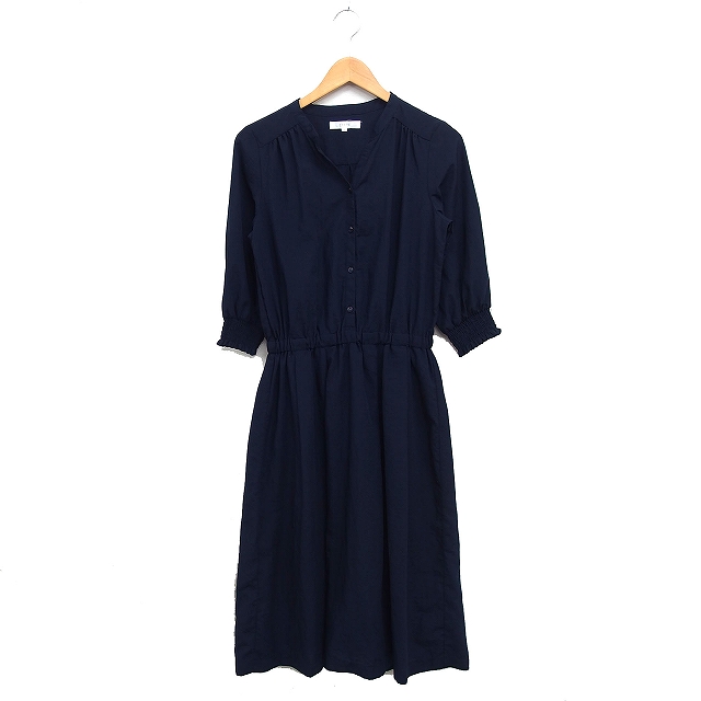 【中古】グローブ grove シャーリングカフス ワンピース 6分袖 ロング丈 タック フレア 無地 M ネイビー 紺 /FT24