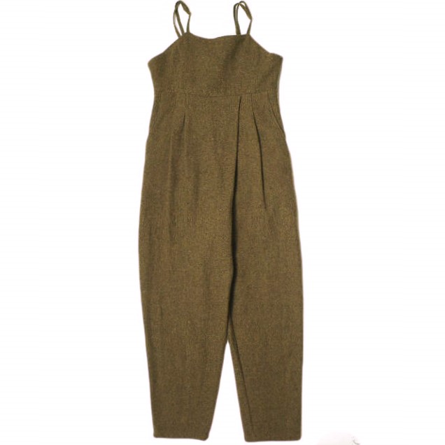このサロペットは、ツイード素材で作られており、温かみのあるブラウンの色合いが特徴です。耐久性があり、季節を問わず着用可能です。