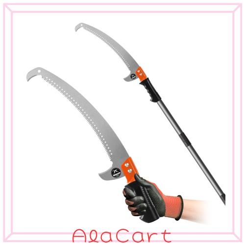 【安全保証と耐久性のある素材】:ポールは高品質のスチールで作られ、パウダーコートが施されています。また、ノコギリの刃は錆びにくいMn鋼で作られています。滑り止めハンドルグリップは快適で安全です。このポールソーは、梯子に登ることなく、高い位置の枝や葉を剪定するのに十分な強度があります。ハンドルの追加補強ネジにより、ソーヘッドがポールに十分に締まり、落下による危険がありません。