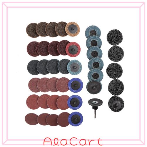 パッケージコンテンツ: 15 x ロールロックサンディングディスク, 15 x サンディングディスク, 6 x フラップサンディングディスク, 5 x ブラックサンディングディスクホイール, 1 x サンディングディスクパッドホルダー (合計 42 個入り)