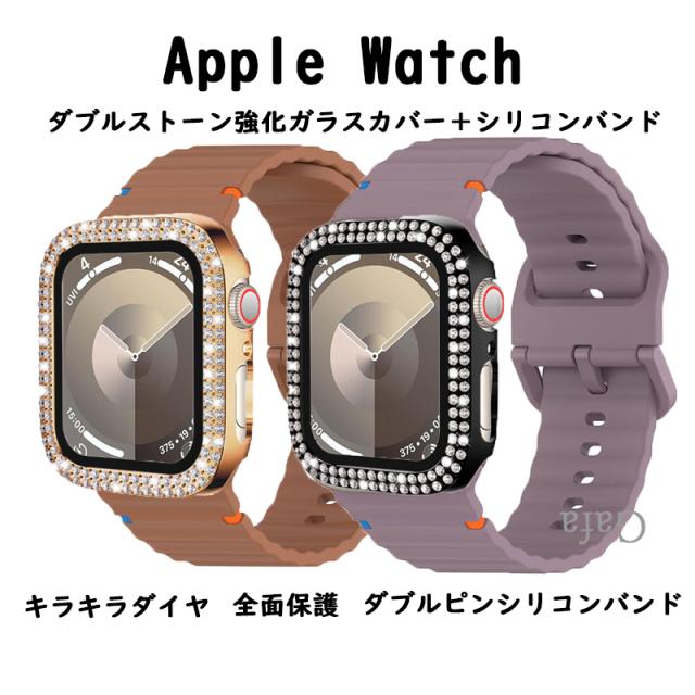 Apple watchバンドカバー アップルウォッチバンドカバーセット 強化ガラスカバー ダブルストーンケース キラキラダイヤカバー AppleWatch交換ベルト デコ 女性 レディースApple Watch 40mm 41mm 42mm 44mm 45mm 46mm 49mm アップルウォッチバンド