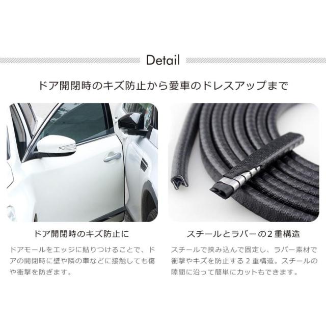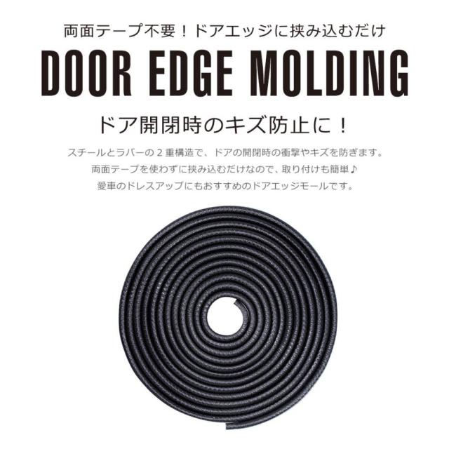 車のドア開閉時の傷防止にオススメのドアエッジモール。スチールとラバーの2重構造で、ドアの開閉時の衝撃や傷を防ぐドアモール。両面テープを使わずに挟み込むだけでなので、取り付けも簡単。愛車のドレスアップにもオススメのドアエッジモールです。