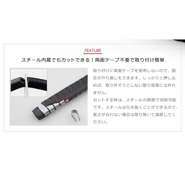 取り付けに両面テープを使用しないので、固定のやり直しも出来ます。しっかりと押し込めば、取り外そうとしない限り、簡単には外れません。カットするときはスチールの隙間で切断可能です。スチールを引き抜くことが出来るので、永さが合わない場合は取り除いて調節してください。