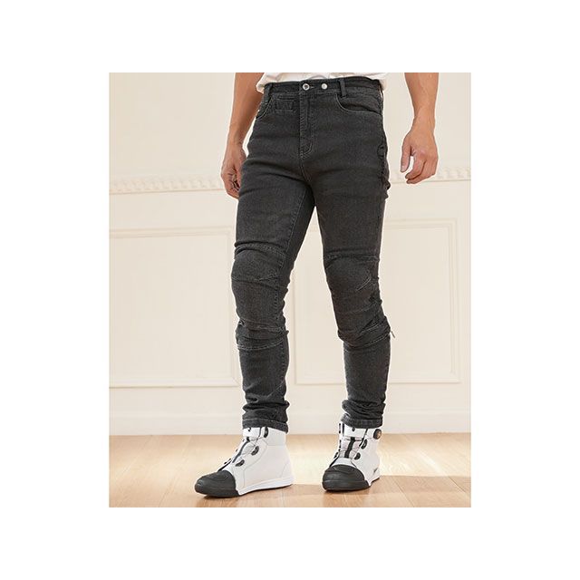 カジュアルに着こなせるシンプルなデザインのジーンズ。膝には薄型CE規格ソフトプロテクターを標準装備し、裾には夜間視認性を高めるリフレクター付き。