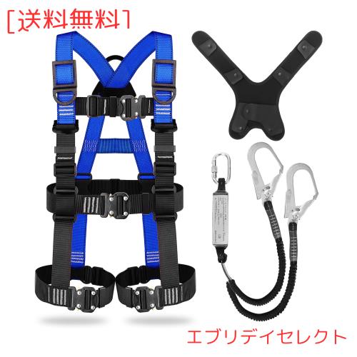 【フルハーネスセット仕様】「材質」ベルト:高強度ポリエステル。バックルとD環:合金鋼。「仕様」ハーネス安全帯 新規格 セットの重量:約2.9kg、参考適合身長:150cm-200cm、各部が調節可能フリーサイズ、腰回り:80-120cm、腿回り:40-85cm、使用可能質量:100kg以下(使用可能質量とは、着用者の体重と装備品の全ての質量を合計した最大値です)。「二丁掛けランヤード」ショックアブゾーバ種別:第一種(4kN)、最大自由落下距離:2.5m、ランヤード長さ:蛇腹伸縮式120-180cm。