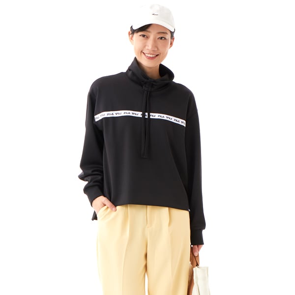 柔らかく軽いダンボールニットを使用したオーバーサイズのプルオーバー。ロゴテープがデザインポイント。衿高さを調整できるスピンドル付き。