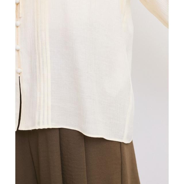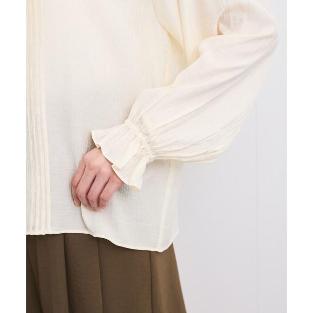 繊細なピンタックと襟元のフリルがフェミニンな印象のデザインブラウス。袖口はゴム仕様で、少し腕にブラウジングさせても落ちにくくラフなニュアンスに。