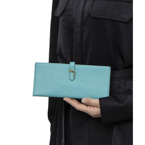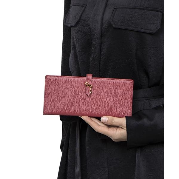 ベルトにリボンが結ばれているような繊細なデザインのリュバンシリーズ。ソフトな風合いの小しぼの型押しレザーは、傷が目立ちにくく軽いのも嬉しいポイントです。カード収納が大容量のラウンド財布や、軽さを生かした薄くコンパクトな形状もラインナップし、ライフスタイルにあったお財布をお選びいただけます。女性らしいリボンモチーフにヴィンテージムード漂う濃いゴールドメッキの組み合わせが、ブランドらしいシックな印象に。さりげなく揺れるビジューが可憐なアクセントを添えています。華やかなカラーバリエーションは、持つだけで気分を上げてくれます!【製品寸法】F : 縦:9, 横:20, 幅:0.5【素材】牛革【メーカーサイズ寸法(実寸)】F : よこ:20cm