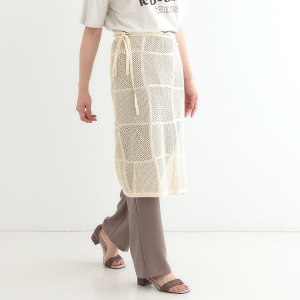 パッチワーク風の編地がポイントの巻きスカート。