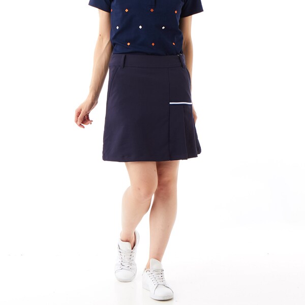 シンプルでありながらもアシメントリーなプリーツが印象的なスカート♪ポケットサイドにマリン風テープがポイントに!ストレッチ性抜群で落ち感もあり、上品で大人コーデにマストなアイテム♪