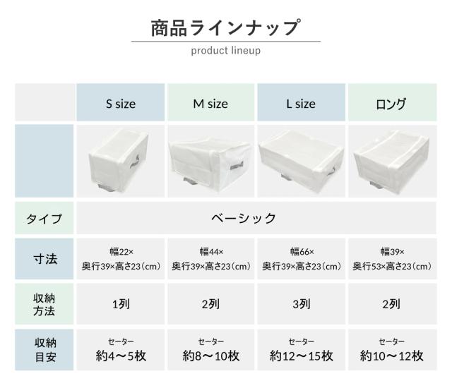 通気性に優れた「ベーシックタイプ」は、それぞれS・M・L・ロングの4サイズ展開しています。豊富なラインナップから収納容量やクローゼットに合わせてぴったりのサイズを見つけることができます。