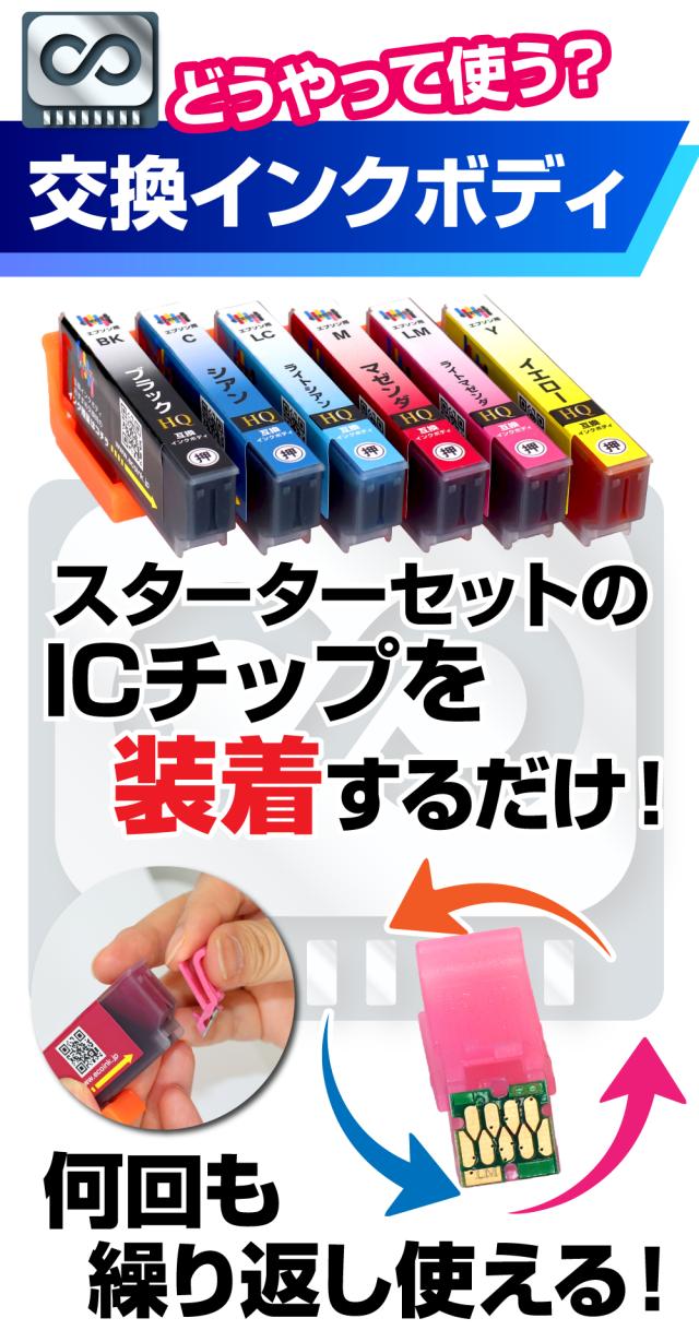 | ご使用済みの永久ICチップ付きインクカートリッジから、永久ICチップを取り外し、交換用インクボディに装着してください。 純正品と同様に、キャップを外しプリンターにセットしてください。 ※スターターセットのICチップは、何度でも再利用することが可能です。 | |