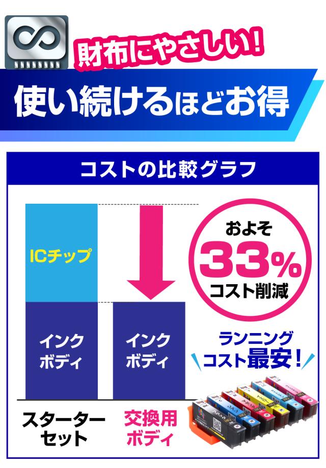 | ICチップのリセットによる「インク残量表示」に対応しています。業界初(※1)、インク残量表示に完全対応で繰り返し使えるエコインク独自の新チップを搭載しています。(※1自社調べ) | |