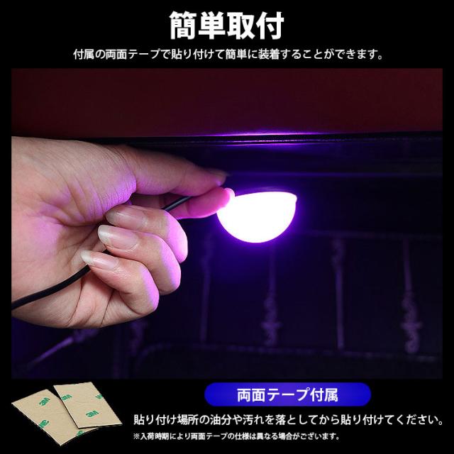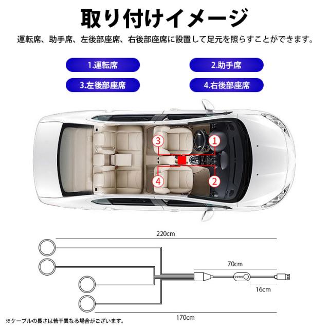運転席、助手席、左後部座席、右後部座席に設置して足元を照らすことができます。