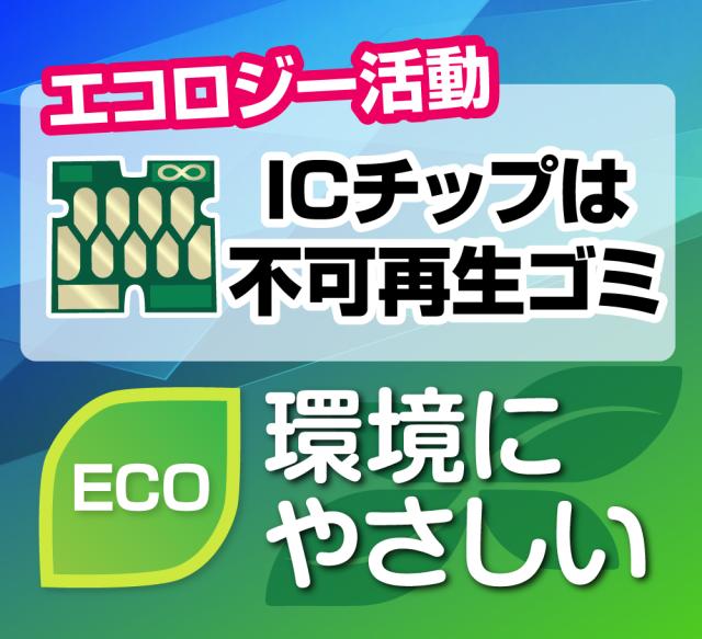 | ICチップのリセットによる「インク残量表示」に対応しています。業界初(※1)、インク残量表示に完全対応で繰り返し使えるエコインク独自の新チップを搭載しています。(※1自社調べ) | |