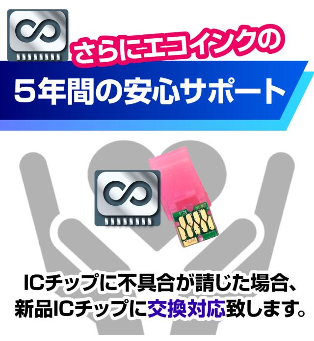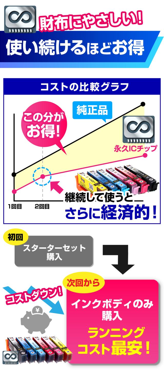 商品の特性 繰り返し使える永久ICチップを装着して使用する互換インクカートリッジです。 インクが無くなった際は、インクボディのみ(ICチップなし)を追加でご購入いただき、 永久ICチップ付け替えることで、ご使用いただけます。 永久ICチップを繰り返し使用することでコストを削減し、環境にも経済的にも優しい商品です。ぜひお試しください。