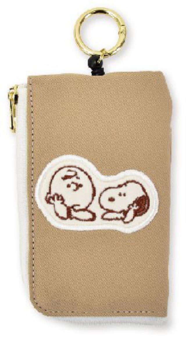 マリSPIK-343 【スヌーピー】【SNOOPY】キーアンドパスポーチ【ベージュ】【茶】【スヌーピーとチャーリー・ブラウン】【アップリケ】【ピーナッツ】【ウッドストック】【ケース】【定期入れ】【カード入れ】【鍵入れ】【収納】【雑貨】【グッズ】【かわい