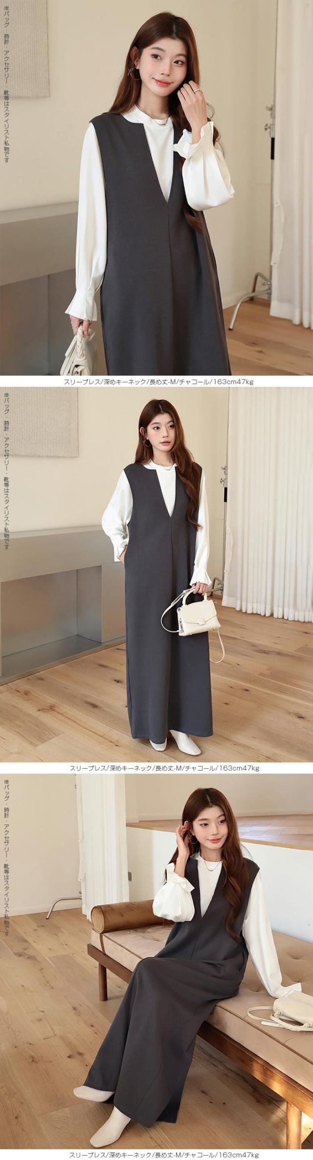 1,500円OFFクーポン!マキシワンピース レディース ロングワンピ 体型カバー 低身長 高身長 春 夏 大人カジュアル シンプル 楽ちん 着回し おしゃれ 送料無料 【選べる3タイプマキシワンピース 長袖|深キーネック】バックスリットありなし選べる ダークエンジェル 春新作