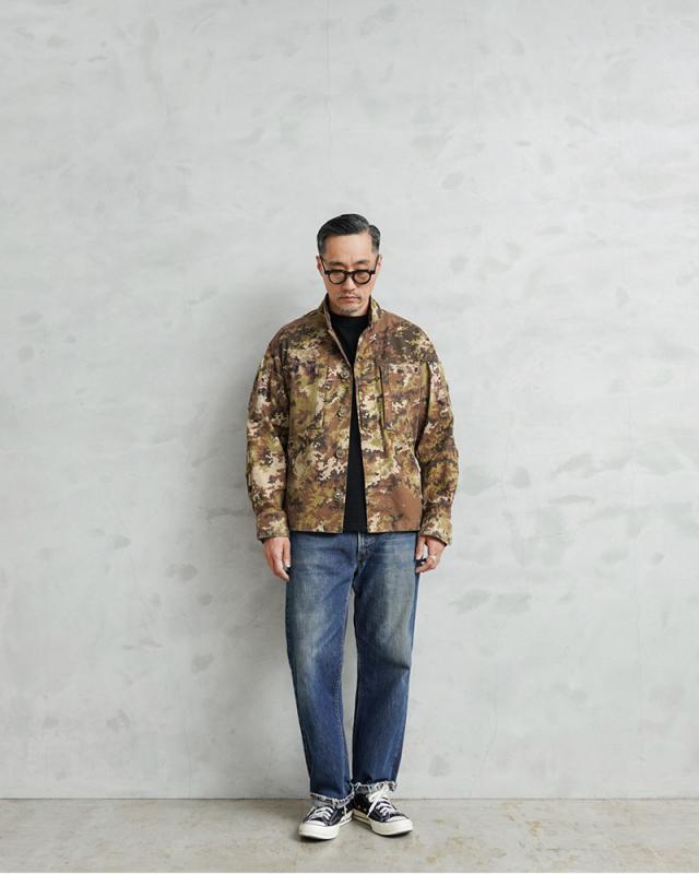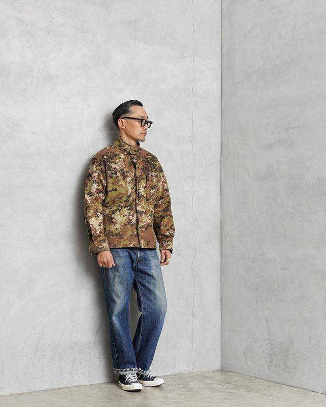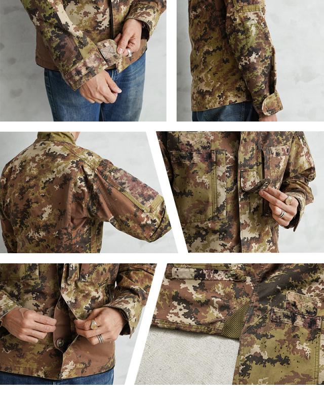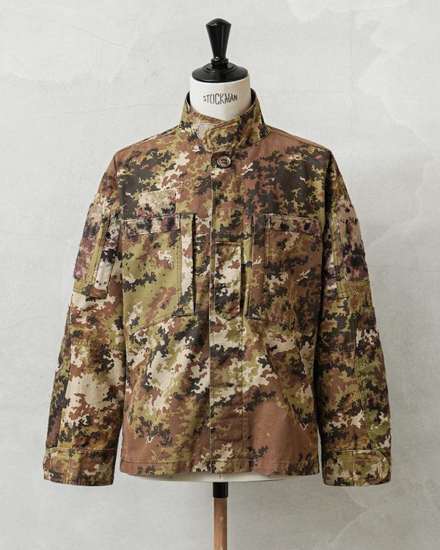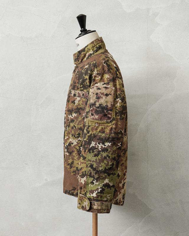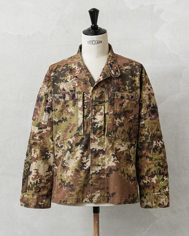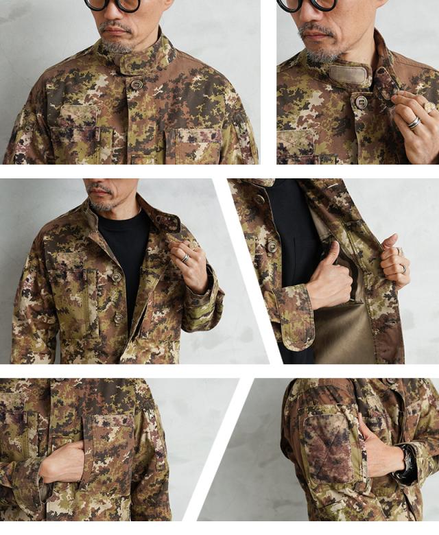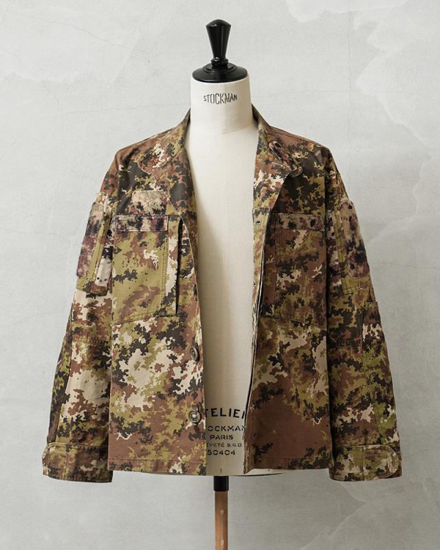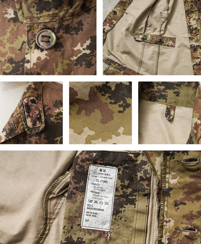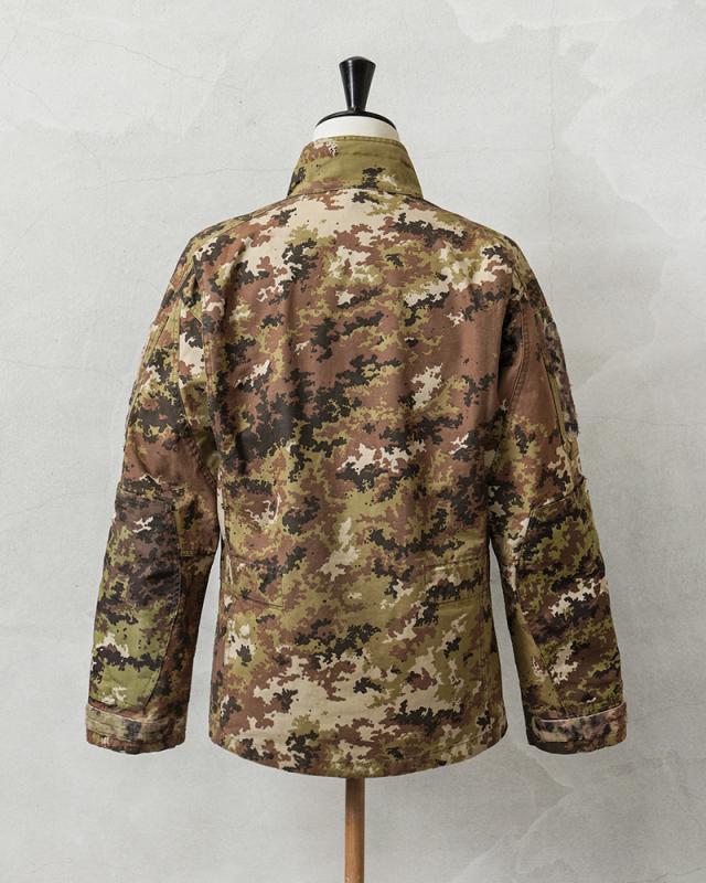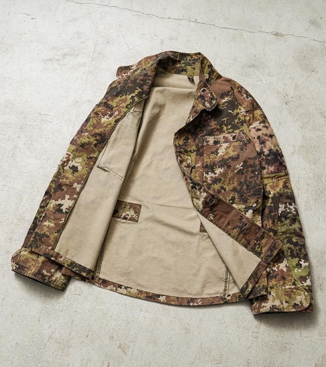 2004年にイタリア陸軍で採用されたベジタトカモは4色のカラーで構成されるカモフラージュパターンで、イタリアの植生にうまく溶け込む迷彩になっており、市街地などの軍事作戦中に遭遇するさまざまな環境や地形にもその効果を発揮するように作られています。2010年代初頭にはイタリア海軍でも採用され、現在ではイタリア全軍で使用されています。イタリア軍現用のコンバットジャケットで、イタリア海軍から多く入荷しています。比翼仕立ての前立ては5つのスロットボタンで開閉し、縦にファスナーで開閉する不規則な六角形の胸ポケットが特徴的です。