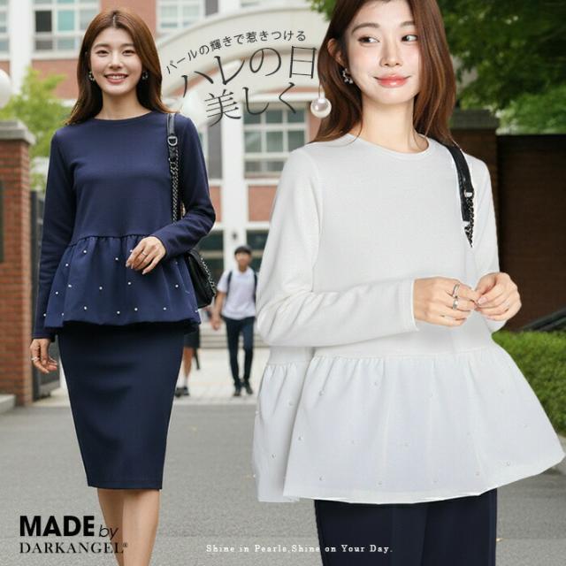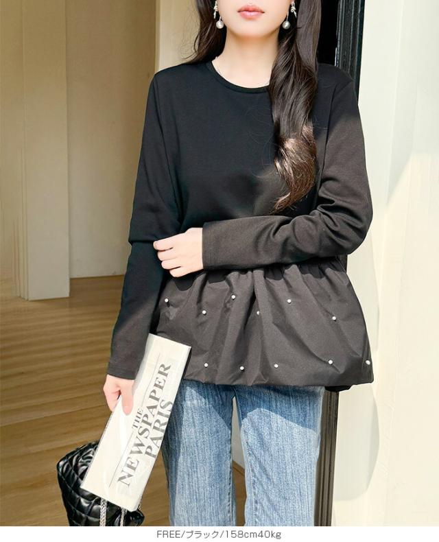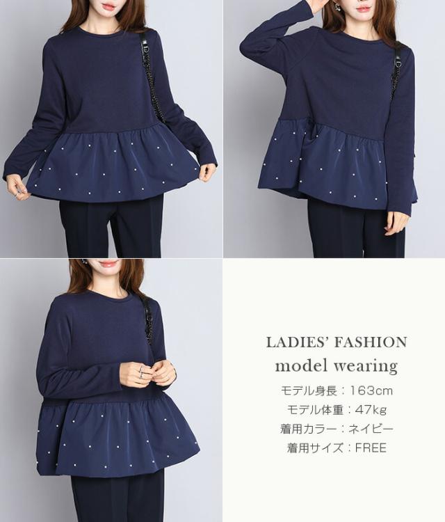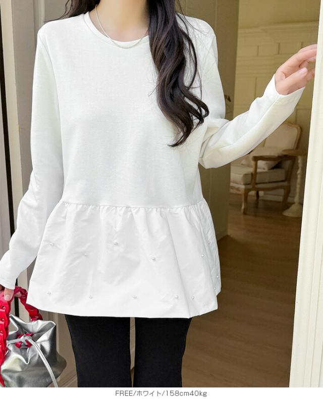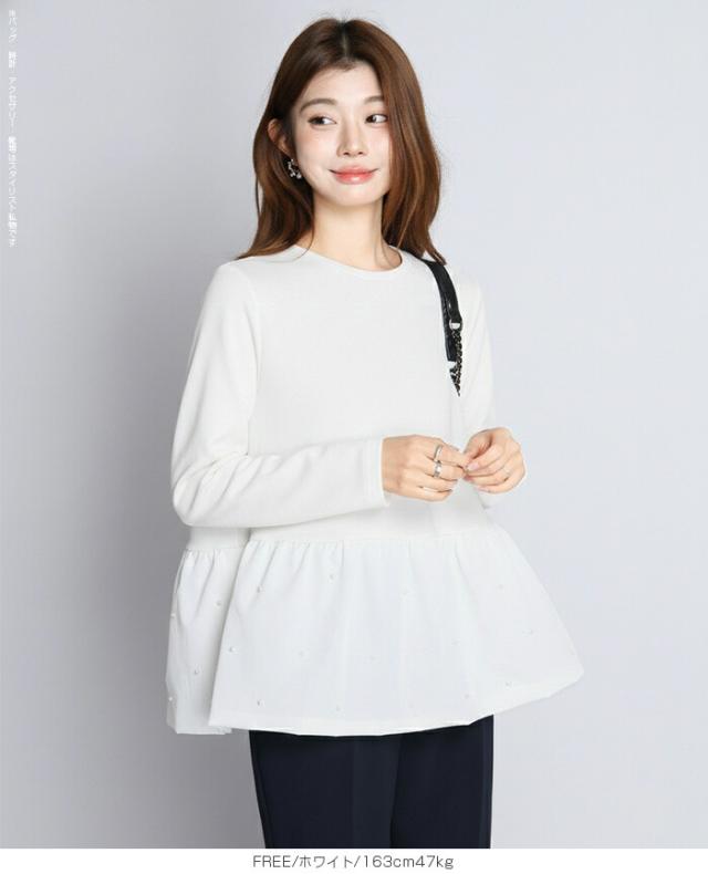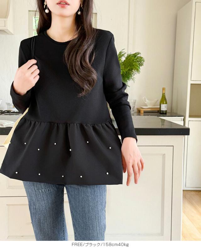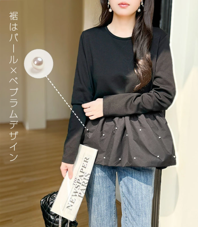 1,500円OFFクーポン!パール付き ペプラム トップス 長袖 レディース カジュアル 体型カバー 大人可愛い きれいめ 上品 おしゃれ シンプル ブラック ホワイト 30代 40代 コーデ 送料無料