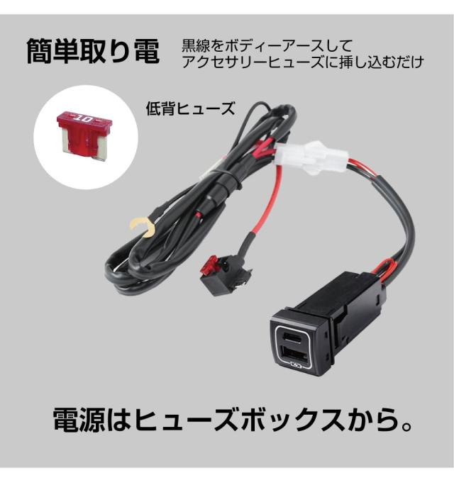 ・トヨタ車 (一部レクサス、ダイハツ、スズキ車)の空きポートに取付できる増設用のUSBポートです。 ・QC(Type-A)とPD(Type-C)2つの高速給電ポートを備えたチャージャーです。 ・純正風仕上げで後付感を減らし、まるで純正かのように増設できます。 ・アクセサリーヒューズにコネクターを接続するだけの簡単電源確保!面倒な配線作業も必要ありません。 ・夜間でも充電口が確認できるようLEDが発光するのでワンポイントイルミネーションとしてもGood! |