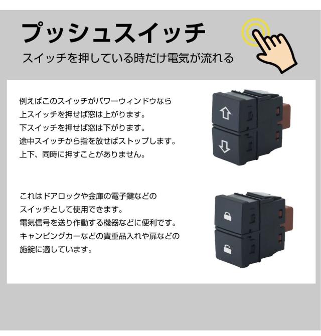 ・ホンダ車の空きポートに取付できる増設用ダブルスイッチです。 ・押している時だけONになる「モーメンタリ」式です。 ・純正風仕上げで後付感を減らし、まるで純正かのようにスイッチを増設できます。 ・配線を接続すれば夜間にはマーク部分を点灯させることができます。 ・使用する電装品の用途に応じて選べる3種類のマーク。 |