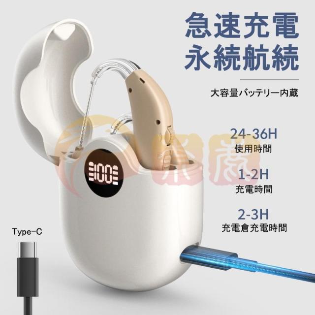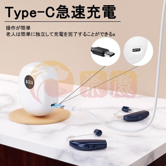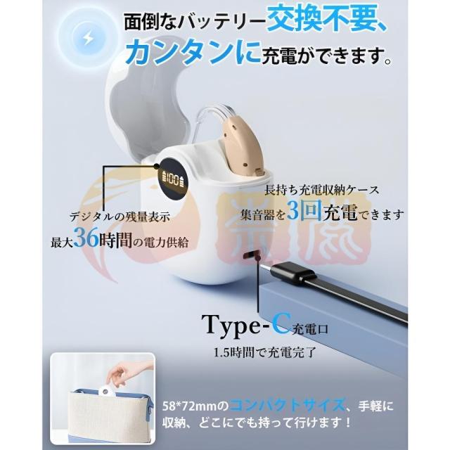 【USB充電式&収納ケース付き】集音器にはUSBのType-Cケーブルがつきましており、簡単に充電できる利便性に加えて、専用の収納ケースが付属します。100分でケースを充電完成、完成したら三回まで集音器を充電できます。