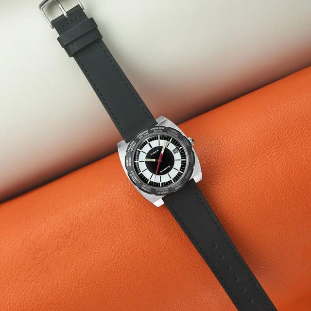 クッションシェイプのケースはサイドがポリッシュ、表面をサテン仕上げにすることでドレスに寄り過ぎずカジュアルにも対応できるデザインになっています。ブルズアイとも呼ばれる1970年代の前後のタイメックスを象徴するモノトーンで視認性の高いダイアルには、蓄光塗料のあしらわれたアワーマーカーと時分針、そしてアクセントにもなっている赤い秒針がバランスよく配されています。