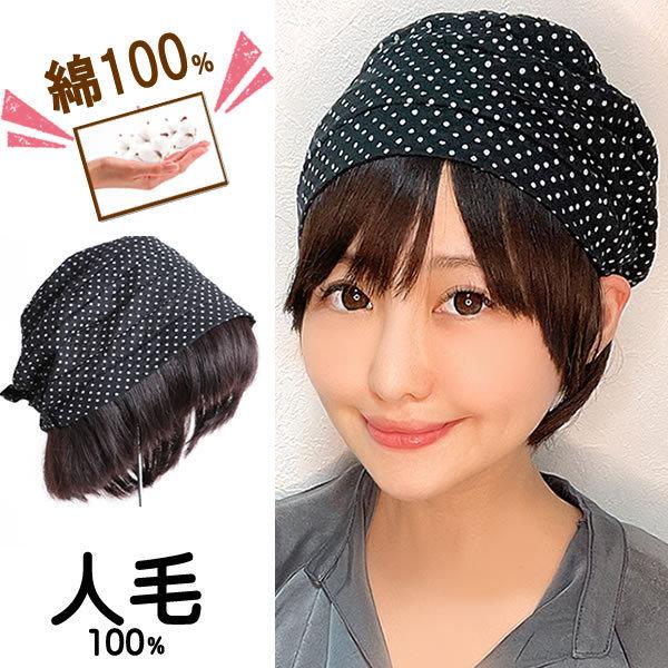 キャップ 髪付き帽子 毛付き帽子 ウィッグ付き帽子 医療用ウィッグ 夏用 医療用 毛付内帽子 帽子用ウィッグ人毛 髪付帽子コットン 綿水玉ドット hb73dot