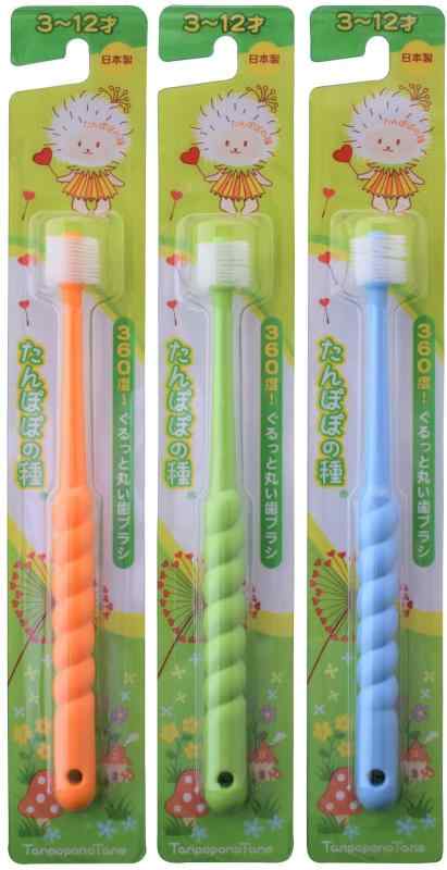 たんぽぽの種 360度ぐるっと丸い歯ブラシ 極細毛 (3〜12歳用) 3本セット ブルー&オレンジ&グリーン