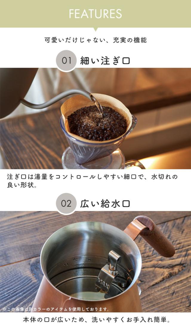 おしゃれなだけでなく、細口の注ぎ口とハンドルの角度にこだわり、ドリップ時に湯量調節がしやすいよう設計されています。