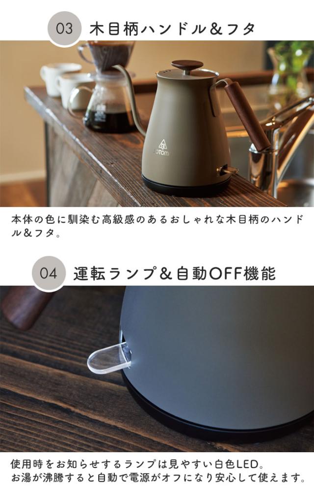 | ・おしゃれな木目柄ハンドル&フタ ・細い注ぎ口 ・ステンレス製 ・キャブタイヤコード ・空だき防止機能 ・沸騰後自動電源オフ ・使用時LEDランプ点灯 |