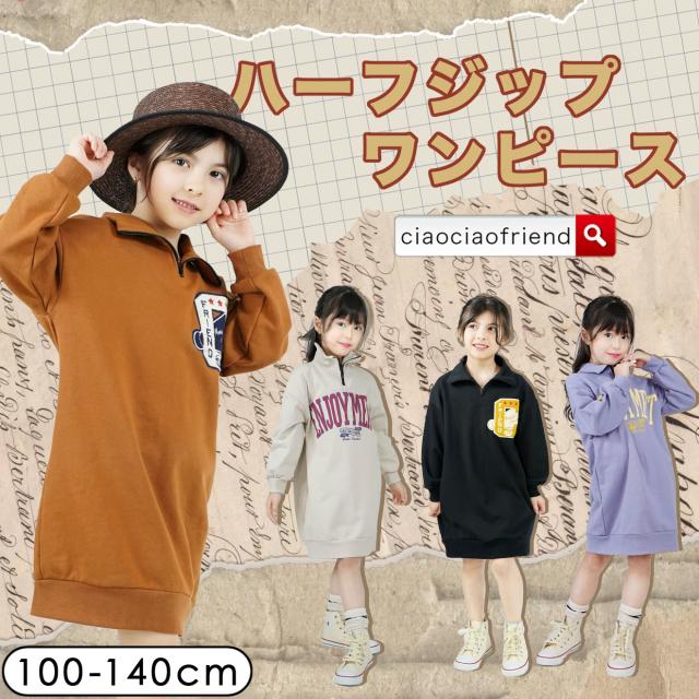 ワンピース スウェット 子供服 キッズ 女の子 ワンピ スウェットワンピ ワンピ ハーフジップ プリント 綿 ファスナー 裏毛 子ども服 こども服 子供 子ども こども 女子 女児 通園 通学 お出かけ 普段着 秋 冬 秋冬 ワッペンー
