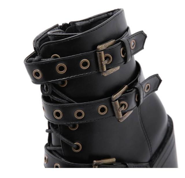 リベットブーツ 超ハイヒール 厚底 ヒールブーツ レディース ショートブーツ ベルト風 美脚 厚底靴 15cm 太めヒール 安定感 大きサイズ 秋冬 コスプレ イベント ハロウィン 仮装 パーティー ハイヒール 舞台用 送料無料