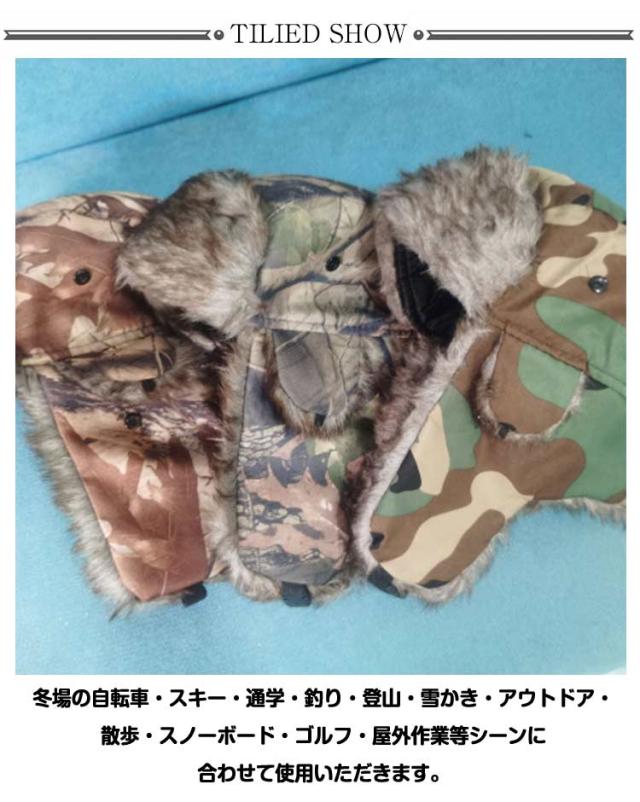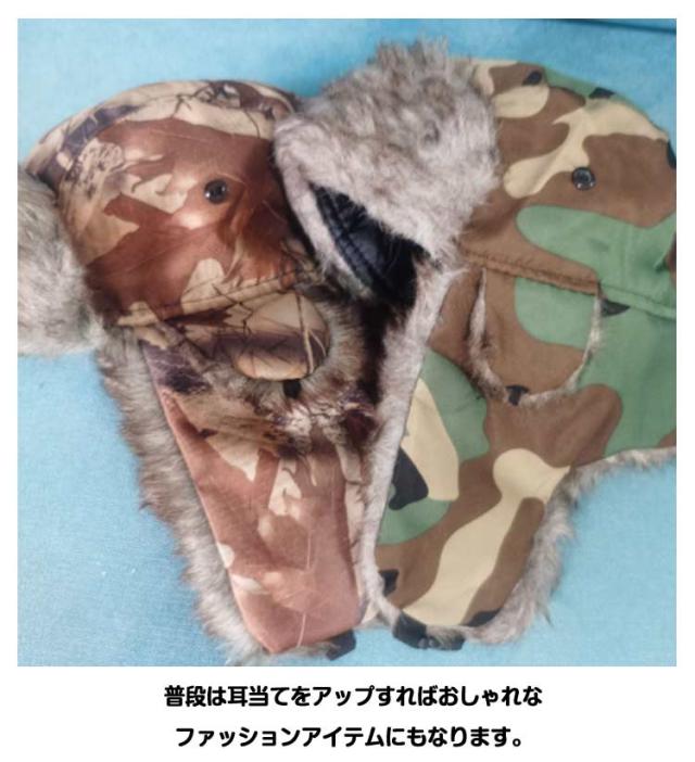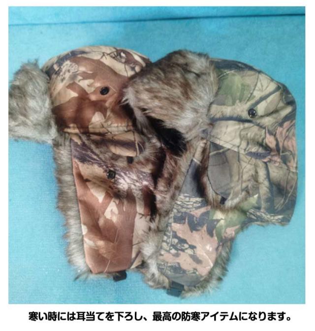 | 防寒にもピッタリな秋冬のトレンドのアビエーターキャップの登場です。 表面はリーフカモフラ柄で、裏地はキルティングとファー仕様で暖かいです。 あごを固定する便利なワンタッチ留め具付き。 寒い時には耳当てを下ろし、最高の防寒アイテムになります。 普段は耳当てをアップすればおしゃれなファッションアイテムにもなります。 冬場の自転車・スキー・通学・釣り・登山・雪かき・アウトドア・散歩・スノーボード・ゴルフ・屋外作業等シーンに合わせて使用いただきます。 | |