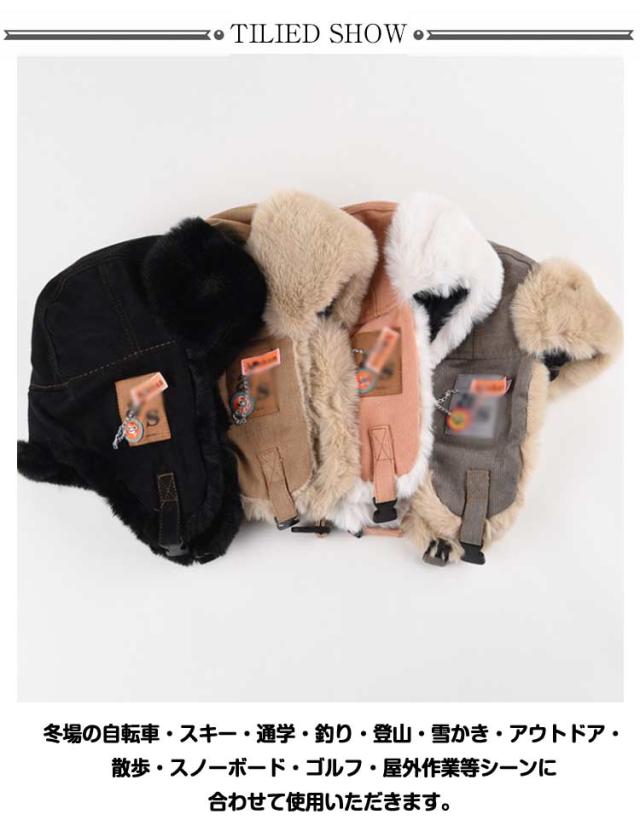 | 可愛さもおしゃれ度高いファーアイテムを取り入れてトレンド感をアップさせて!パイロットキャップ。 サッと被るだけで季節感を取り込めるファー帽子はこれからの必需アイテム! あごを固定する便利なワンタッチ留め具付き。寒い時には耳当てを下ろし、最高の防寒アイテムになります。普段は耳当てをアップすればおしゃれなファッションアイテムにもなります。 冬場の自転車・スキー・通学・釣り・登山・雪かき・アウトドア・散歩・スノーボード・ゴルフ・屋外作業等シーンに合わせて使用いただきます。 | |