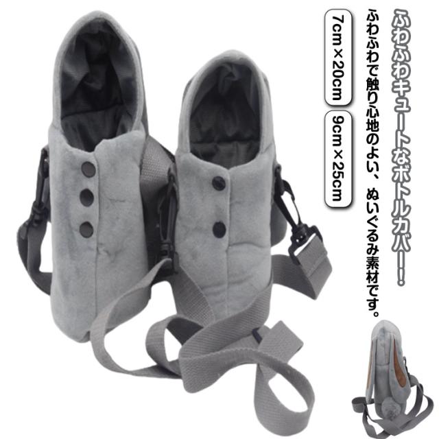 350ml用 肩掛け 水筒ケース 水筒カバー 500ml 送料無料 ボトルカバー ストラップ付 かわいい ふわふわ ショルダーストラップ ウサギ 灰色