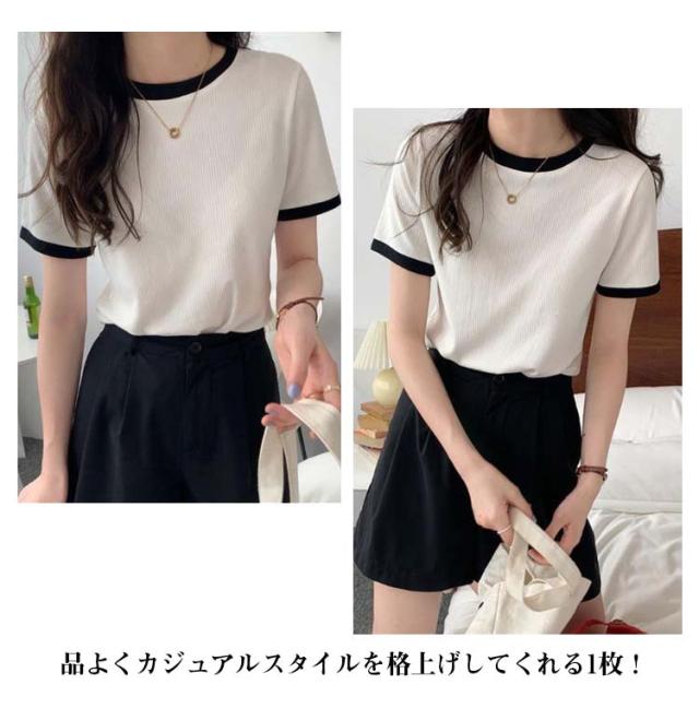 | 柔らかく優しいサラッとした肌触り◎春夏にうれしい半袖Tシャツ 品よくカジュアルスタイルを格上げしてくれる1枚! バランスの良いネックと袖口の配色ラインでスタイリングにアクセントを添えます。 コンパクトな身頃で女性らしさもばっちりです。 ラウンドネックデザインは優しく穏やかなイメージをもたらします。 夏ファッションに必ず大活躍、ボトムスとのコーデも自由なアイテム! 普段着や仕事着、インナーやルームウェアとしても◎ | |