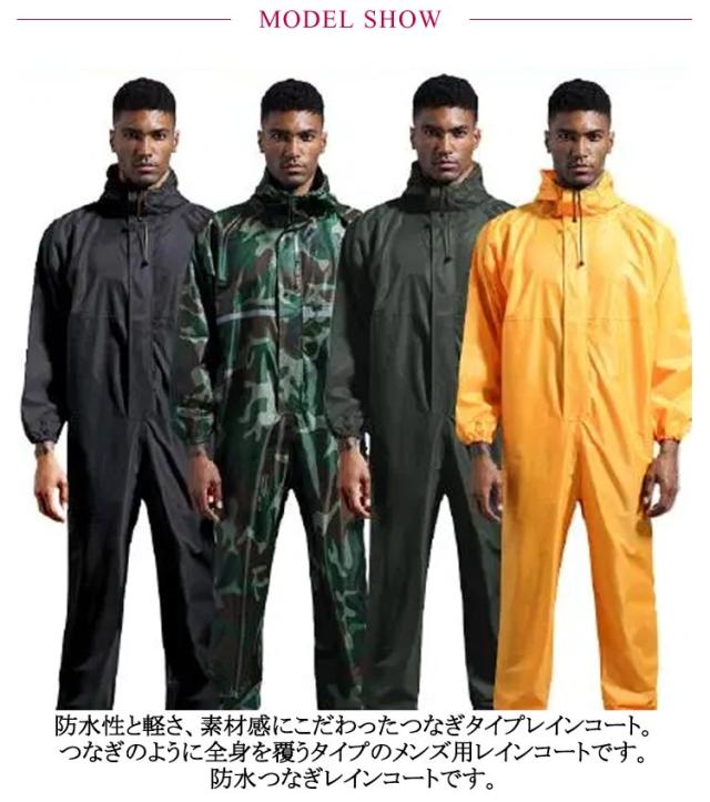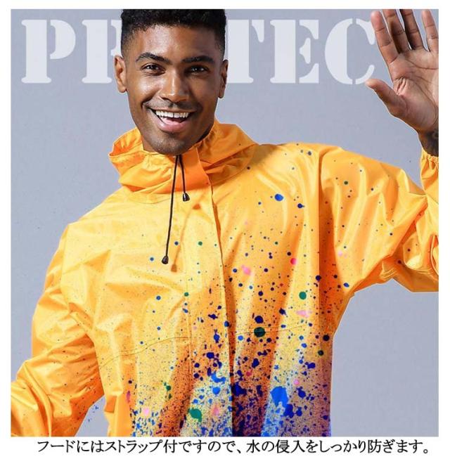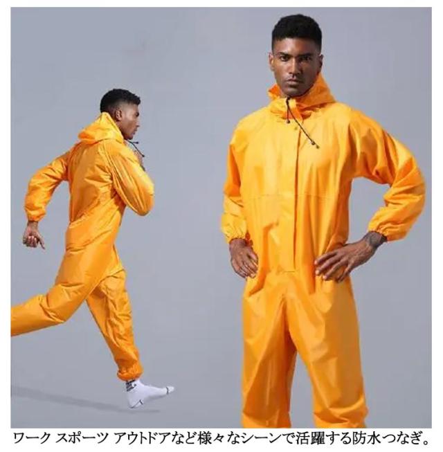 | 防水性と軽さ、素材感にこだわったつなぎタイプレインコート。つなぎのように全身を覆うタイプのメンズ用レインコートです。防水つなぎレインコートです。 フード付きで全身をすっぽり覆ってくれる防水着です。 雨天作業におすすめのつなぎのレインウェア 。 全身カバーしてくれるので、上半身が水はねで濡れることもありません。 台風などの緊急時の救護作業などの場合にも最適です。 ダブルジッパータイプで着脱簡単です。 フードにはストラップ付ですので、水の侵入をしっかり防ぎます。 伸縮性のある袖口デザインです。 無地と反射テープ付きの2タイプからお選び頂けます。 蛍光テープ付きは車などからの視認性も高まり、安心安全にご利用いただけます。 ワーク スポーツ アウトドアなど様々なシーンで活躍する防水つなぎ | |