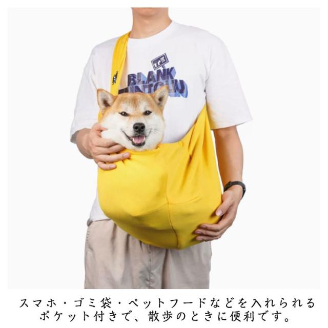 | 犬・猫用 スリングバッグ。 飛び出し防止ストラップがついた、飛び出し防止設計のペットスリング。 ドッグスリング本体に飛び出し防止用のストラップを付けて、わんこの首輪やハーネスと繋げることができます。 幅広のショルダーストラップで長時間使用しても疲れにくい。 スマホ・ゴミ袋・ペットフードなどを入れられるポケット付きで、散歩のときに便利です。 使わないときは小さく畳んで、お手持ちのバッグに収納することができます。 お散歩・お出かけ・旅行に、いつでもどこでも一緒に快適にお出かけできるペットバッグ!猫、ウサギ、小型犬、小動物に適しています。 | |