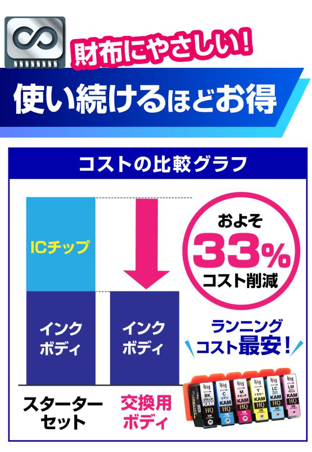 | ICチップのリセットによる「インク残量表示」に対応しています。業界初(※1)、インク残量表示に完全対応で繰り返し使えるエコインク独自の新チップを搭載しています。(※1自社調べ) | |