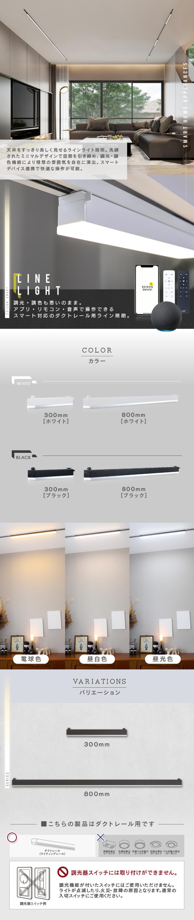 [300mm] エジソンスマート ラインライト 30cm LED 照明器具 ダクトレール用照明 天井 壁面 LEDバーライト 直線 真っすぐ フラット スリム 細長い スマート照明 Wi-Fi 工事不要 ハブ不要 アプリ操作 調光調色 遠隔操作 音声操作 アレクサ対応 Google Home対応 Siri対応