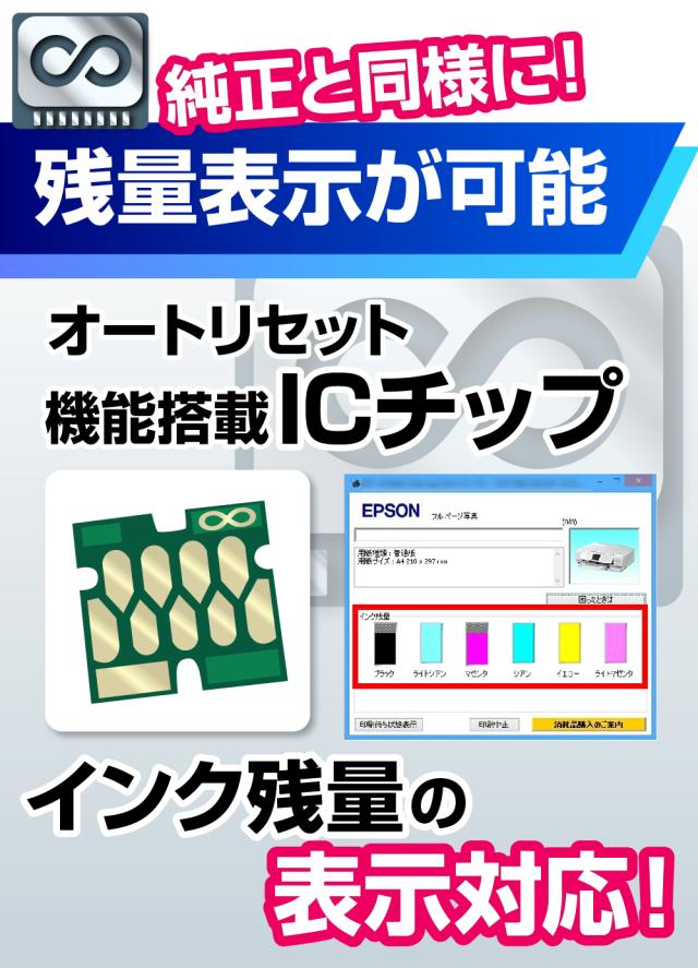 | ICチップのリセットによる「インク残量表示」に対応しています。業界初(※1)、インク残量表示に完全対応で繰り返し使えるエコインク独自の新チップを搭載しています。(※1自社調べ) | |