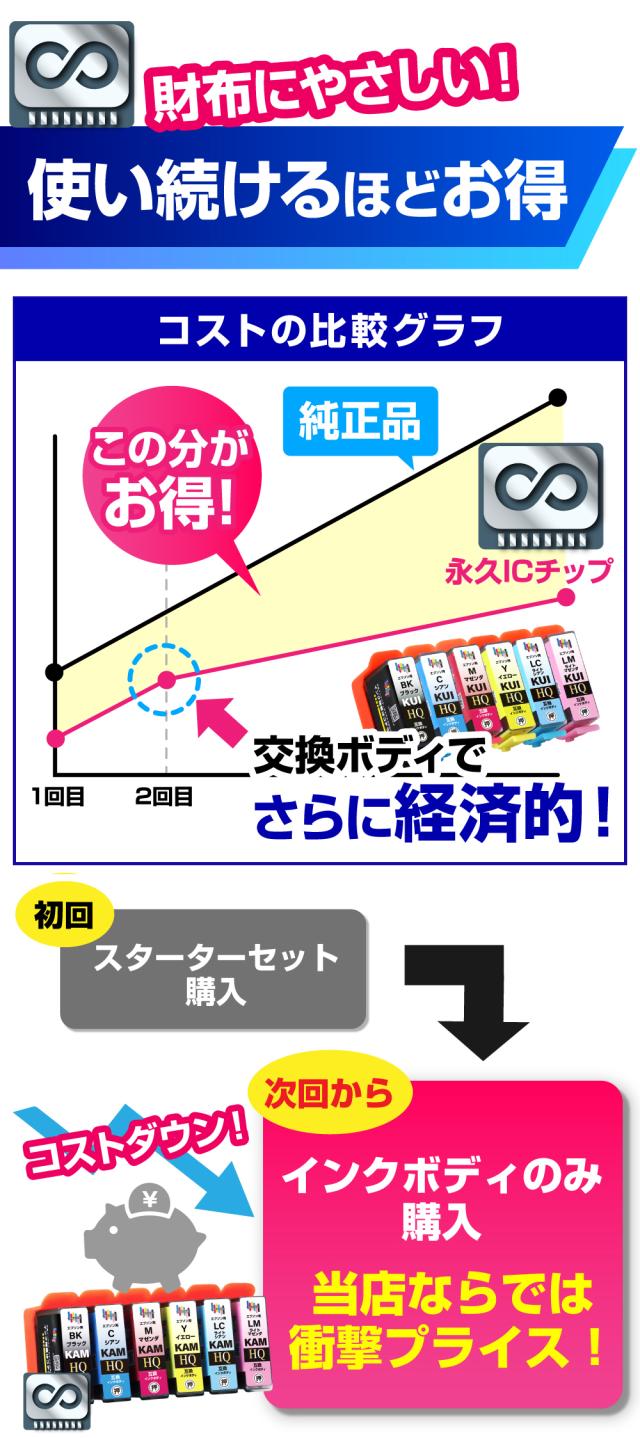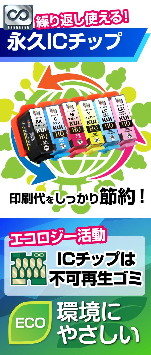 商品の特性 繰り返し使える永久ICチップを装着して使用する互換インクカートリッジです。 インクが無くなった際は、インクボディのみ(ICチップなし)を追加でご購入いただき、 永久ICチップ付け替えることで、ご使用いただけます。 永久ICチップを繰り返し使用することでコストを削減し、環境にも経済的にも優しい商品です。ぜひお試しください。