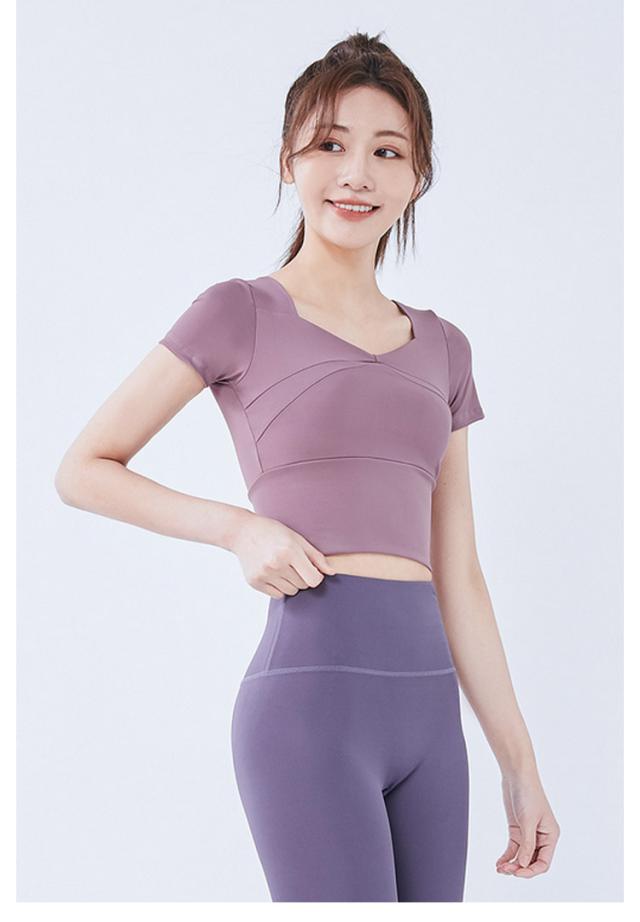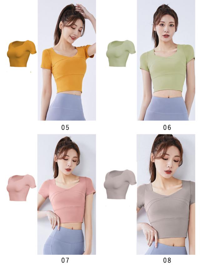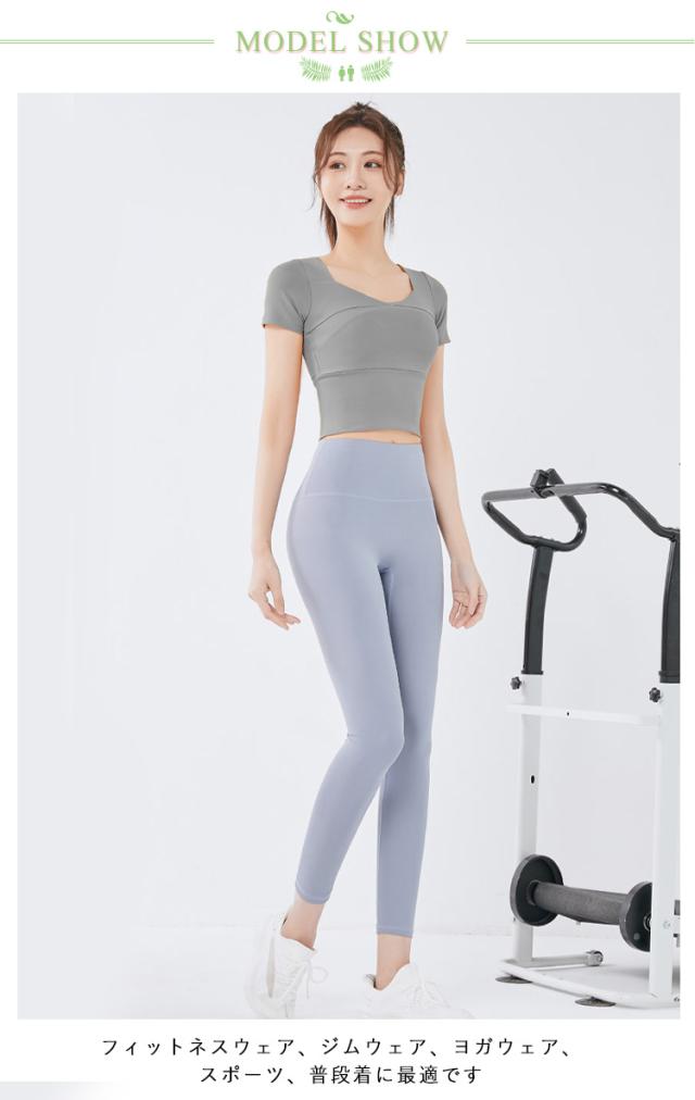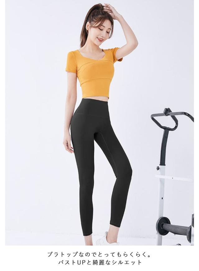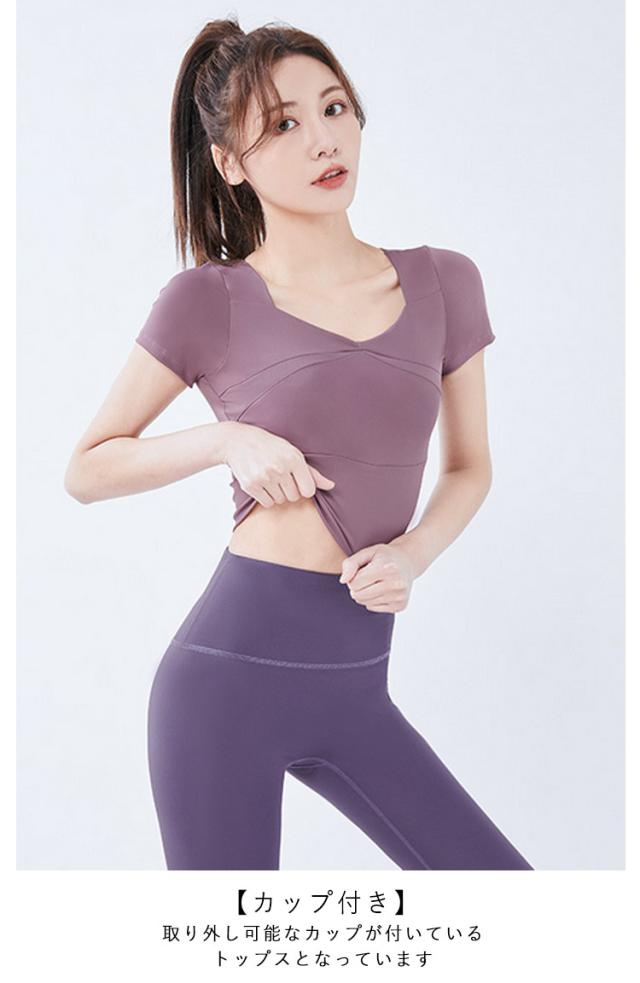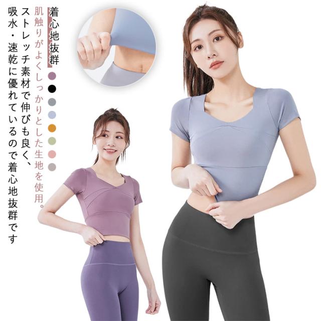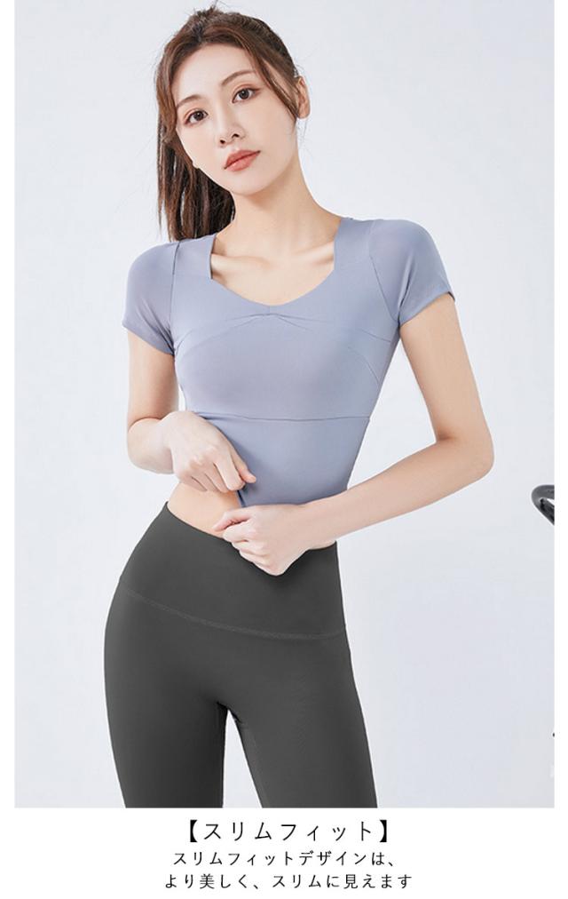 ヨガウェア 吸汗速乾 ロング ギャザー フィットネスウェア ホットヨガ ダンス タック トップス ホットヨガ レディース スポーツウェア ストレッチ Tシャツ 半袖カップ付き ショート丈 通気 トレーニング 動きやすい 体型カバー 運動 ハーフタンクトップ 無地