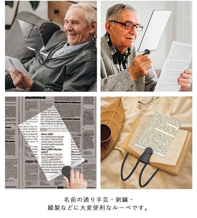 | 両手が使えて読書やスマホの操作におすすめの拡大ルーペです。 首掛けにもスタンドタイプ 取り外して手持にもなる3way仕様。 軽量のシリコンホースで自由自在に角度を替えれるので大変便利です。 メガネタイプと違って, 遠くのものを視線を替えるだけですぐに見ることが出来ます 老眼で見にくくなった細かい作業もらくらく!母の日・敬老の日の贈物に最適です。 名前の通り手芸・刺繍・縫製などに大変便利なルーペです。 | |