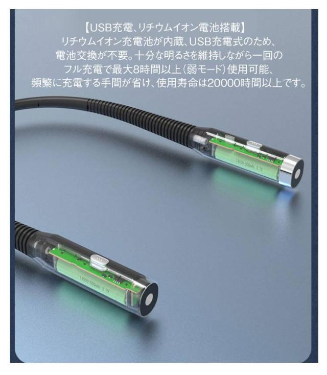 | 【3つの照明モード、技術の集大成で作られたLEDライト】 フラッドライトモード、スポットライトモード、スポットライト&フラッドライトモードを3つの照明モード備えています。 【USB充電、リチウムイオン電池搭載】 リチウムイオン充電池が内蔵、USB充電式のため、電池交換が不要。十分な明るさを維持しながら一回のフル充電で最大8時間以上(弱モード)使用可能、頻繁に充電する手間が省け、使用寿命は20000時間以上です。 【アームフリーなデザインで、良いマルチシーン体験】 フレキシブルアームは首、腕、パイプなど任意なところに自由自在に曲げられます。ライトスイッチ部分も360°回転可能です。 【多用途に大活躍、いつもの便利】 夜の読書、看護師のような夜勤のお仕事、ウオーキングや犬の散歩、夜間のカメラ撮影、キャンプ、旅行、釣りなどの場合にも大活躍です。地震、台風、停電、洪水、防災など緊急状況にも使えます。 | |
