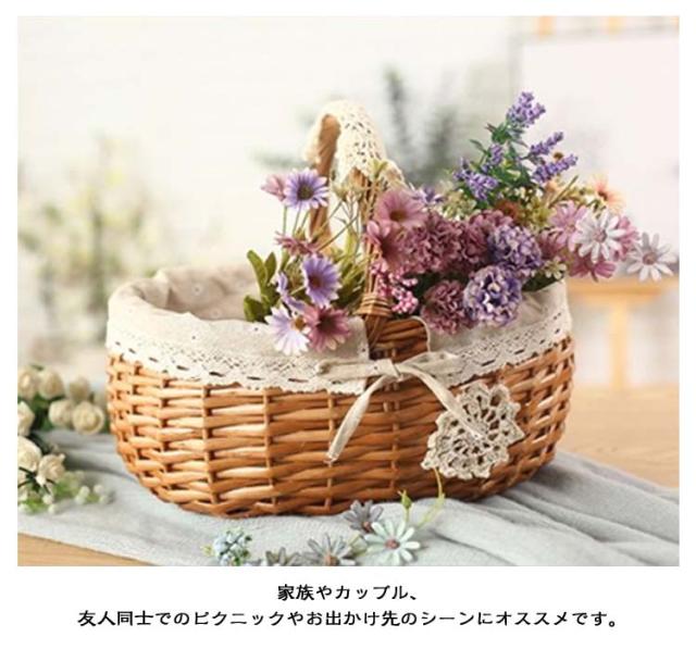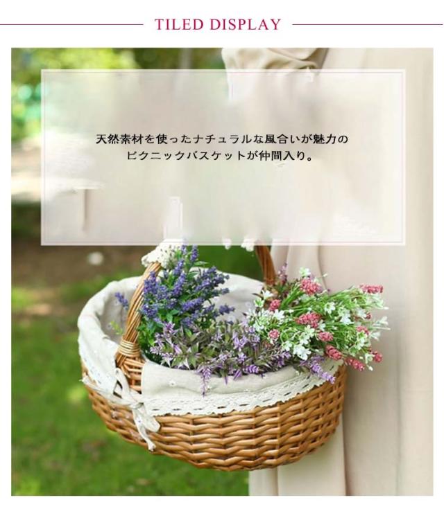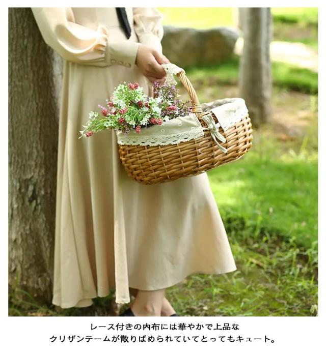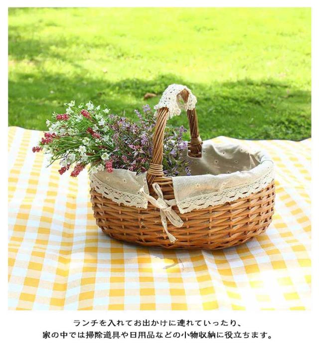| オーバル型のワンハンドルバスケット。【Sサイズ】【ラタン編み】 膨らみのあるころんとしたかわいらしいフォルム。 天然素材を使ったナチュラルな風合いが魅力のピクニックバスケットが仲間入り。 レース付きの内布には華やかで上品なクリザンテームが散りばめられていてとってもキュート。 ランチを入れてお出かけに連れていったり、家の中では掃除道具や日用品などの小物収納に役立ちます。 家族やカップル、友人同士でのピクニックやお出かけ先のシーンにオススメです。 | |