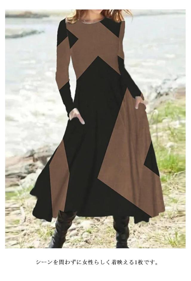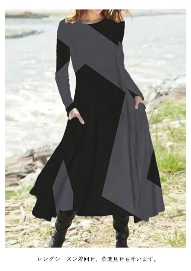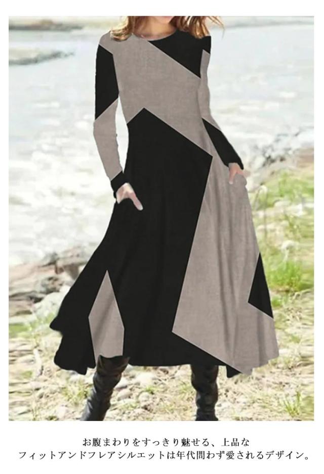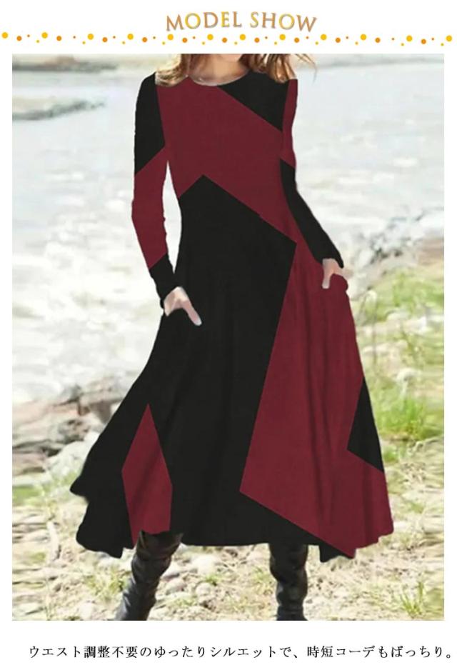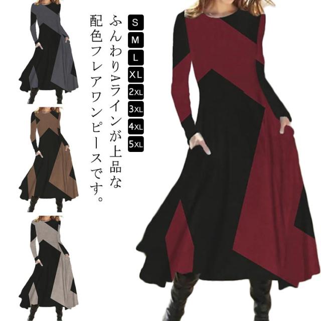 フレア レディース フレアワンピース 長袖ワンピース 長袖 配色ワンピース 配色ワンピース Aライン マキシワンピース ロングワンピース 幾何学 切り替え 配色 ロング丈 フレアワンピース 大きいサイズ 春 秋 冬 レッド グレー